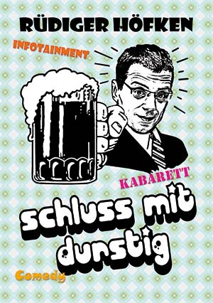 Rüdiger Höfken, Schauspieler, Theaterbetreiber und Kabarettist feierte mit seinem 5. Soloprogramm „Schluß mit Durstig!“ bereits große Erfolge im hauseigenen Krefelder Wohnzimmertheater PODIO, wo die Produktion seit Juni 2013 stets ausverkaufte Vorstellungen erlebte.
